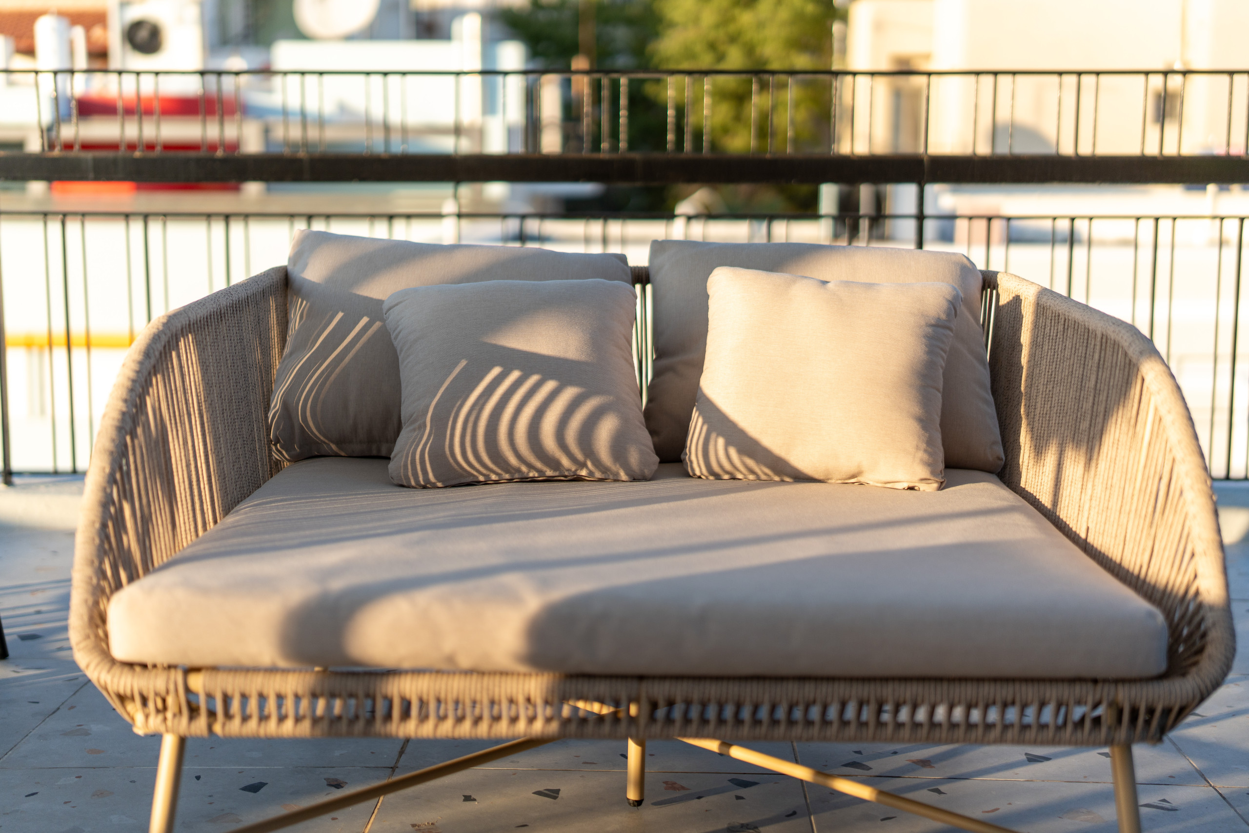 Is a very big apartment that can host 6 guests. Has 2 bedrooms, one sofa bed for 2 people and a dining table for 5 people. Is located on a high floor with an elevator, and features a very large balcony of 50 square meters with sitting area and hanging lounge chair. Additionally, it is fully equipped with all the necessary amenities you might need, and more.