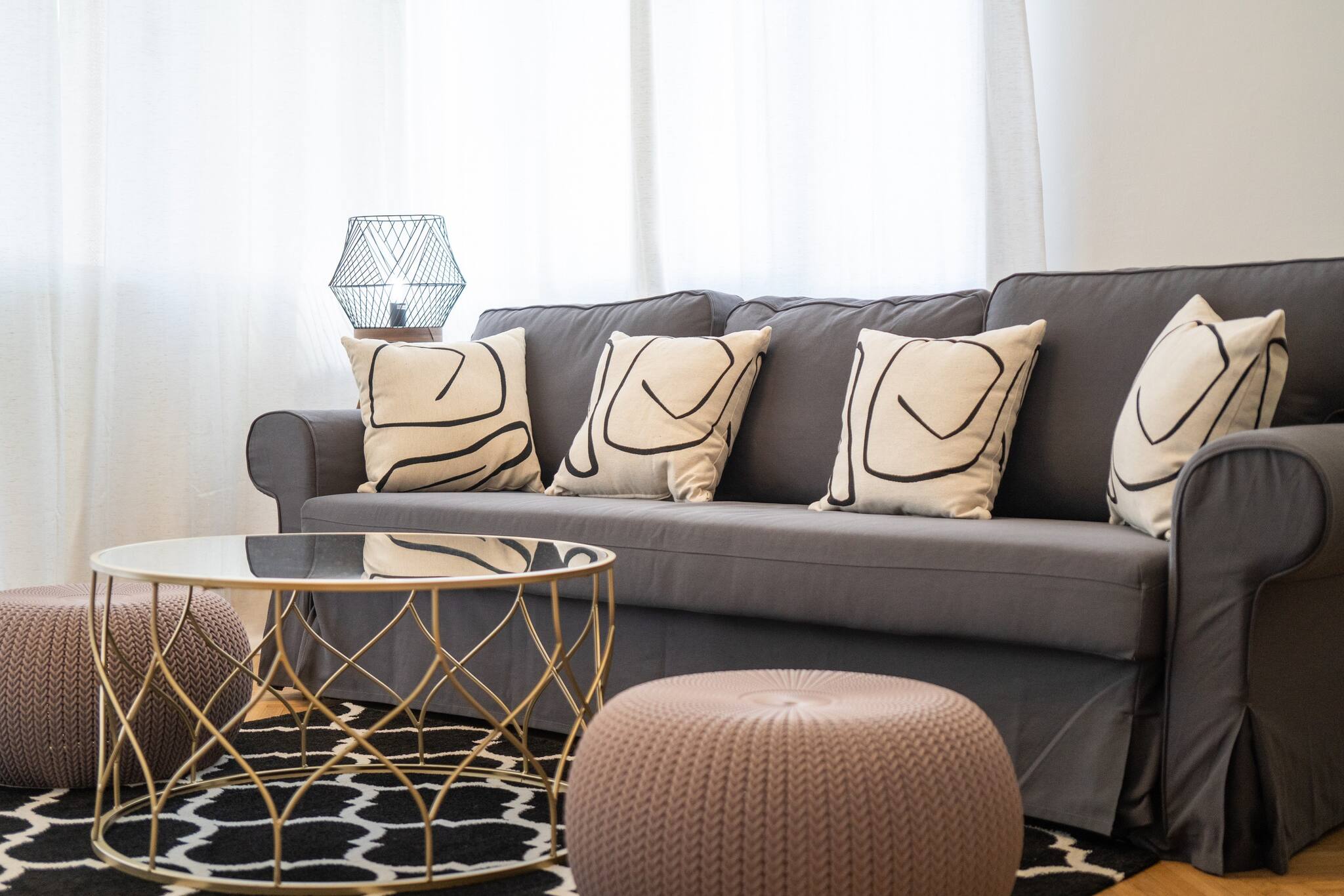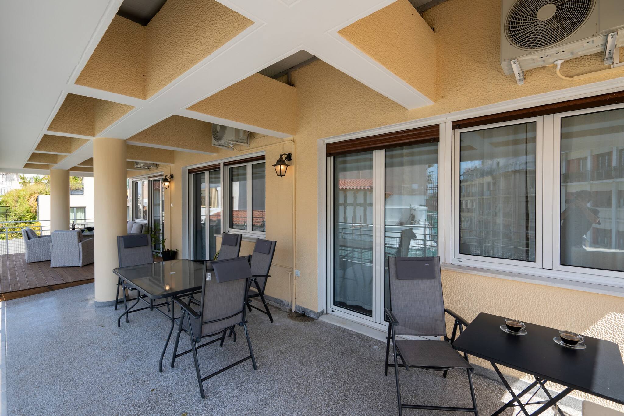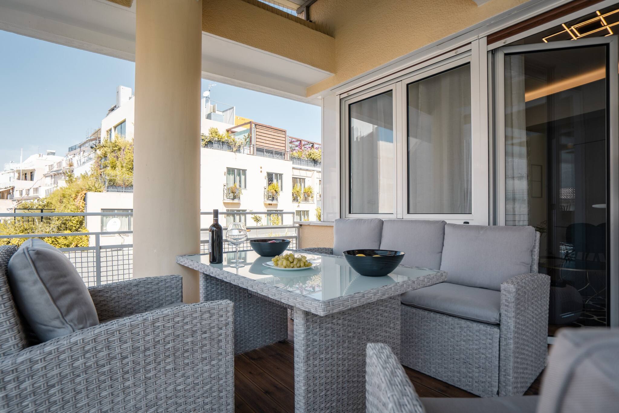 Is a very big apartment that can host 6 guests. Has 2 bedrooms, one sofa bed for 2 people and a dining table for 6 people. Is located on a high floor with an elevator, and features a very large balcony of 60 square meters with two sitting areas and one large dining table. Additionally, it is fully equipped with all the necessary amenities you might need, and more.